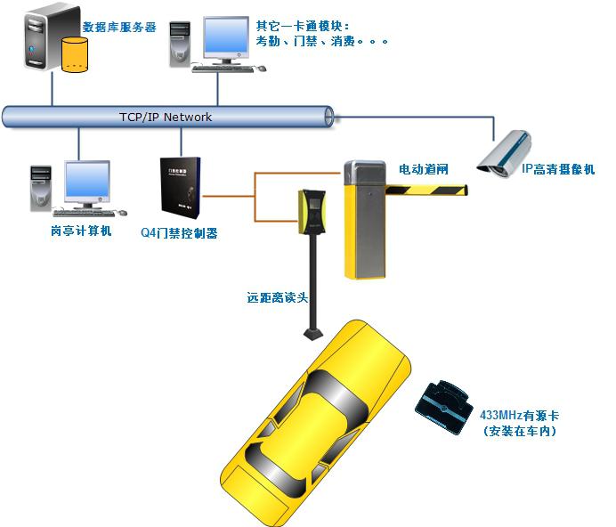 在車內擋風玻璃合適位置安裝有源卡,選用最成熟的433MHz頻段有源卡,另加38KHz紅外激勵功能;該卡平時并不會發射電磁波,當靠近遠距離讀頭的時候,該讀頭首先用38KHz的紅外線來激勵和定位所捕捉到的有源卡,車內的有源卡激勵之后,采用433MHz的頻率和讀頭一對一綁定通訊,一旦綁定之后,即使有另外一張卡進入感應范圍,系統也可以辨別,有效解決了433MHz定向讀卡的問題;遠距離讀頭讀到卡號之后,通過WG26格式和Q4門禁控制器通訊,Q4收到卡號之后,判斷權限,若有權,則驅動道閘工作,并存儲和實時上報刷卡記錄,崗亭計算機收到記錄之后,立即啟動IP高清攝像機進行抓拍照片,整個過程1秒之內完成(這個步驟可選,并非一定需要);閘機下方有兩組地感,車輛在未駛出地感之前不會落桿,防止砸車。