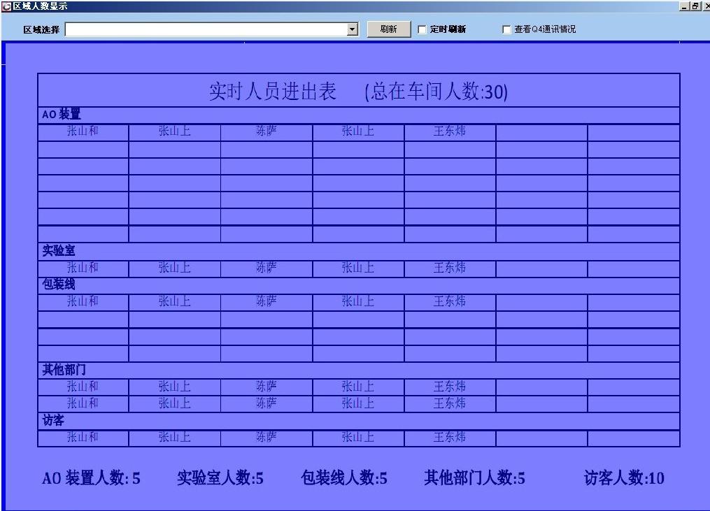 實現原理:T1\Q4\T4等設備均是基于TCP/IP通訊的設備,其獨特的數據采集機制既可以確保數據即時上報到服務器,且可以確保100%不丟失,在此基礎之上,系統可以按門區自由劃分區域,等于每個區域既有進的門區,也有出的門區,進和出互相抵消,只有進沒有出的卡,系統就認為依然在區域內,從而得出區域的人數和具體的名單,這個數據可以在保衛室等合適的地方電子看板即時展示。另外,符合到報警的條件,系統將給出報警,符合需要反過來控制設備關閉進入權限和開通進入權限的情況,系統也將即時反應。
