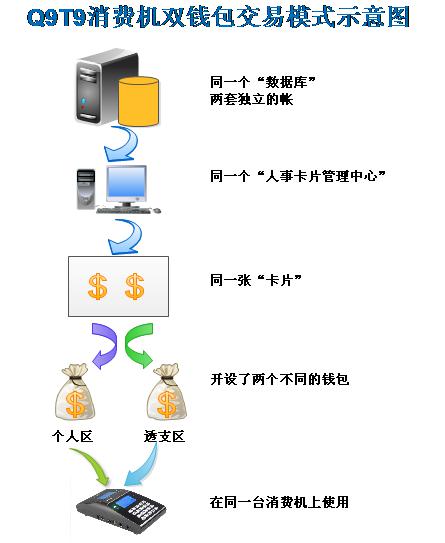 雙錢包是指在同一張卡、同一臺消費機、同一套消費軟件下實現兩個錢包賬戶的管理,分為透支區和個人區,透支區具有按卡類每個月首次消費自動清零,然后自動補貼的功能,透支區和個人區均有獨立的日限額、次限額功、刷卡間隔等限制功能,當透支區不符合交易條件時候,消費機自動切換到個人區去扣款,透支區和個人區在軟件上面是分兩套不同的賬目管理,等同把兩套原本獨立的消費系統合并到了一套。