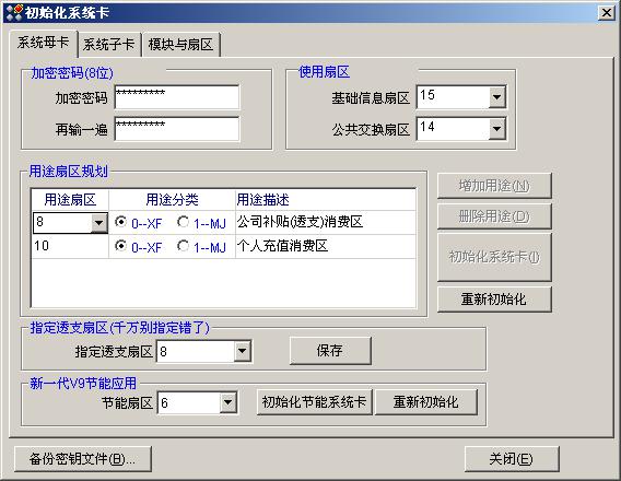要啟用雙錢包功能,在初始化系統的時候必須具備兩個消費扇區,若消費扇區不相鄰,則必須指定透支扇區,如下圖: